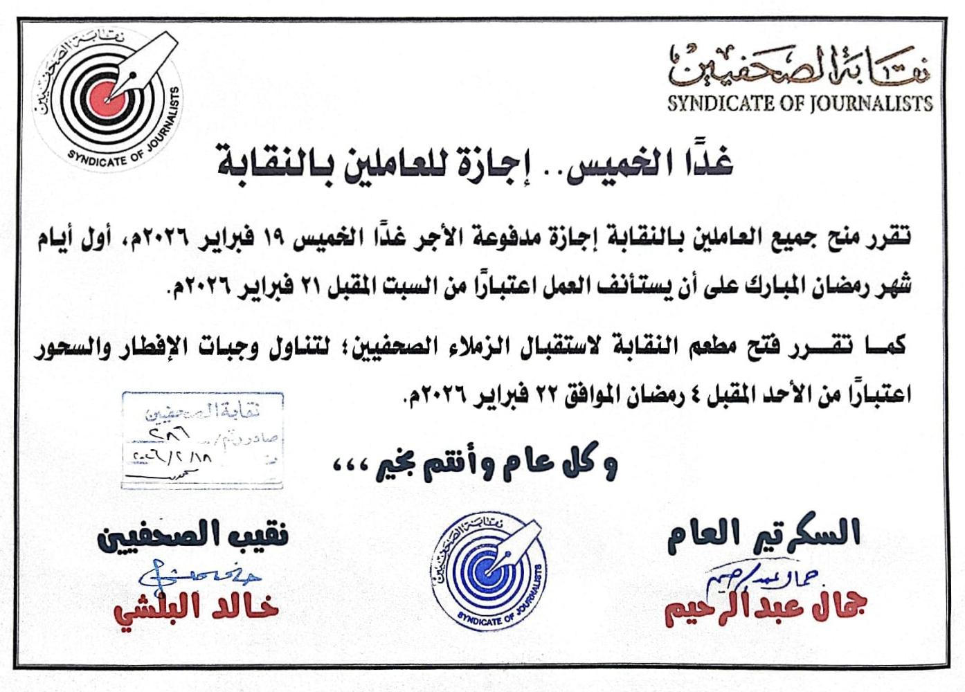 أعلنت نقابة الصحفيين، منح جميع العاملين بالنقابة، إجازة مدفوعة الأجر غدًا الخميس الـ19 من فبراير 2026م، أول أيام شهر رمضان المبارك، على أن يستأنف العمل اعتبارًا من السبت المقبل الـ21 من نفس الشهر 2026م.