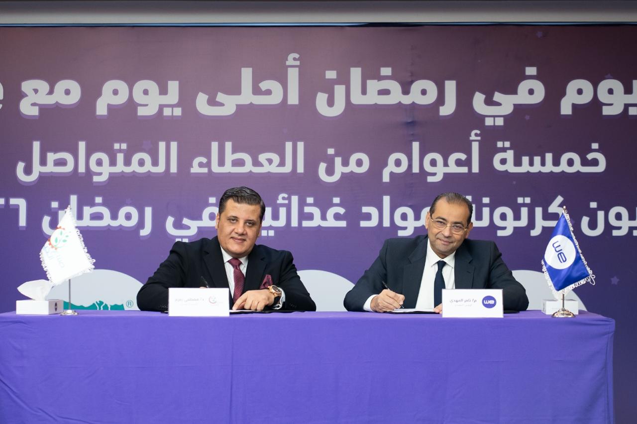 وقعت الشركة المصرية للاتصالات "WE" اليوم، بروتوكولي تعاون مع مؤسسة مصر الخير، ومؤسسة صناع الخير للتنمية، لإطلاق واحدة من أكبر مبادراتها المجتمعية، والتي تستهدف توزيع مليون كرتونة مواد غذائية خلال شهر رمضان المبارك على مستوى الجمهورية، وذلك في إطار حرص الشركة على مشاركة الشعب المصري أجواء الشهر الكريم، وتعزيز قيم التعاون والتكاتف بين أفراد المجتمع.