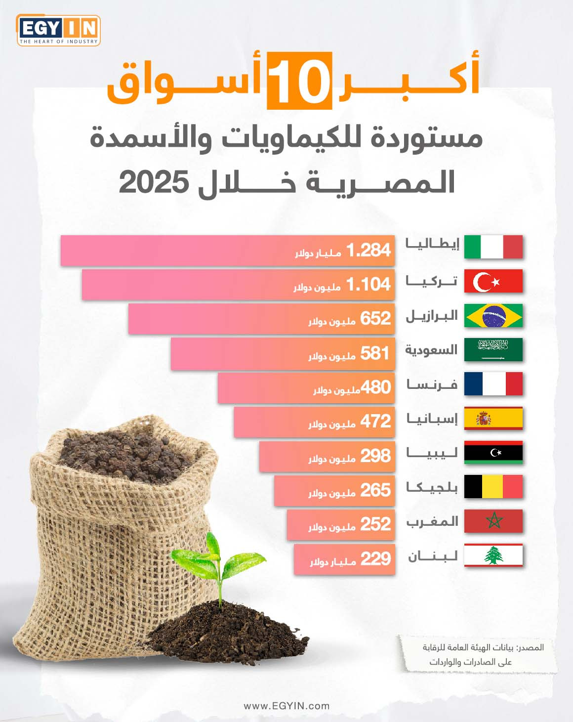 إيطاليا في صدارة أكبر 10 أسواق مستوردة للكيماويات والأسمدة المصرية خلال 2025