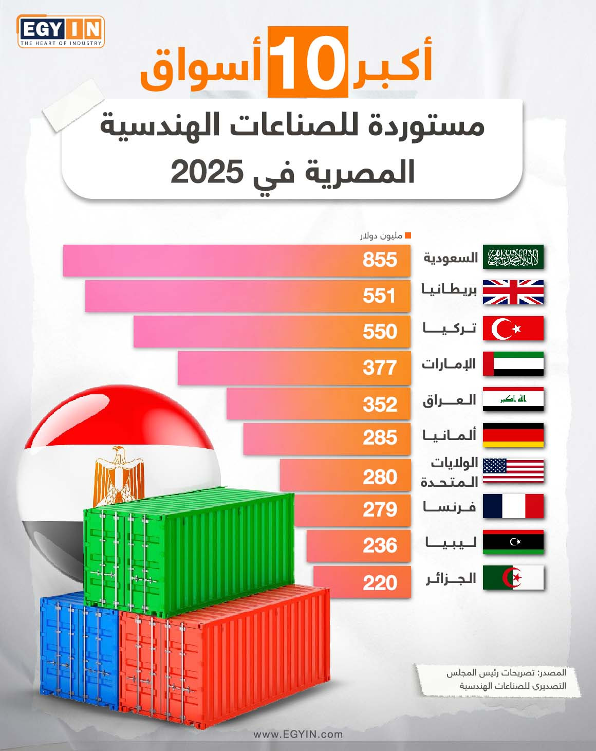 فيما استوردت المملكة صناعات هندسية بقيمة 855 مليون دولار خلال عام 2025، بحسب بيانات المجلس التصديري للصناعات الهندسية.