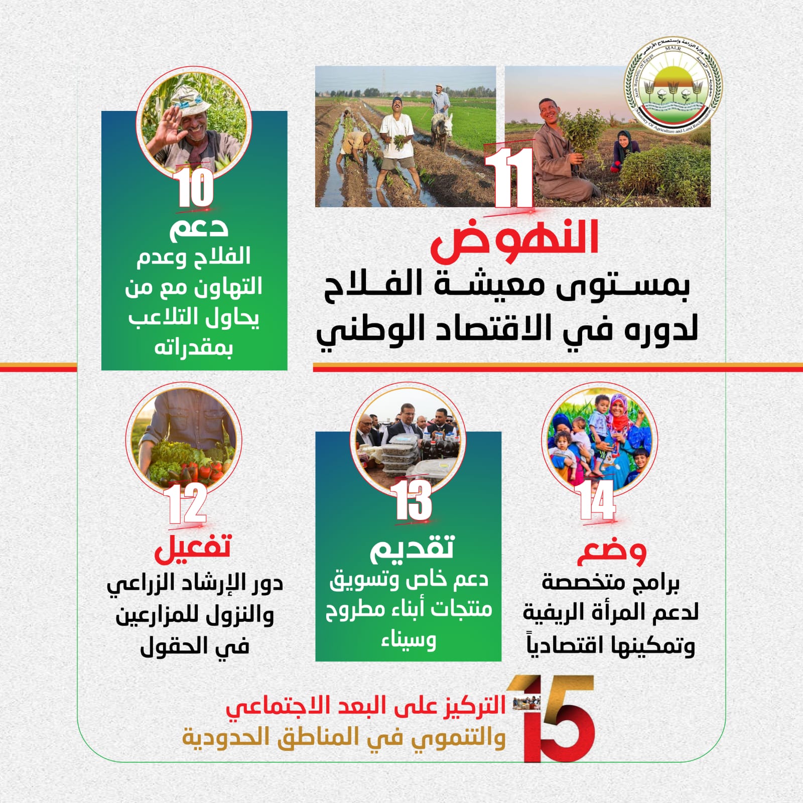 ووجه وزير الزراعة، بالتركيز على البعد الاجتماعي والتنموي في المناطق الحدودية، موجهاً بتقديم دعم خاص وتسويق منتجات أبناء مطروح وسيناء، مع وضع برامج متخصصة لدعم المرأة الريفية وتمكينها اقتصادياً من خلال المشروعات الصغيرة والمتوسطة.