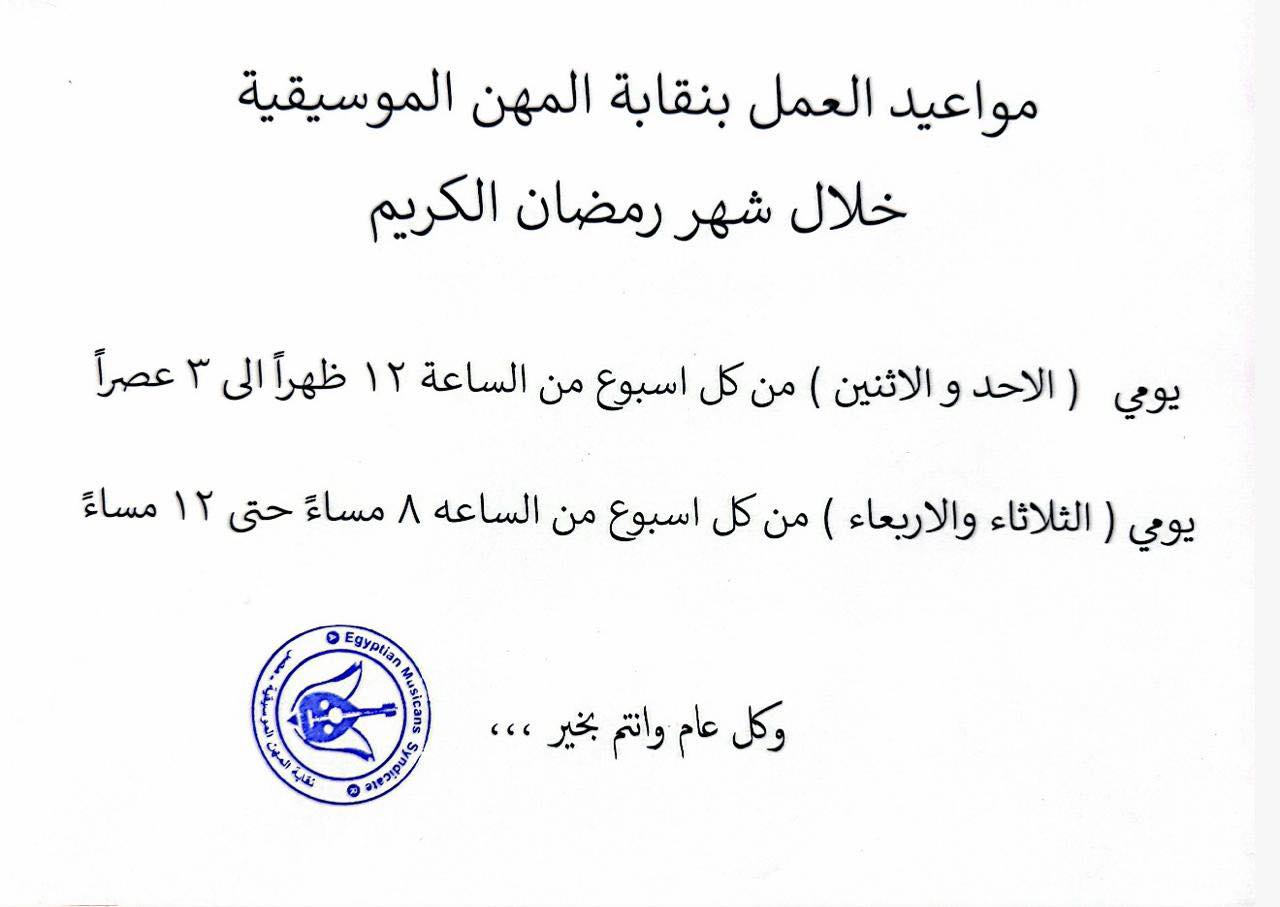مواعيد العمل بنقابة المهن الموسيقية خلال شهر رمضان 2026