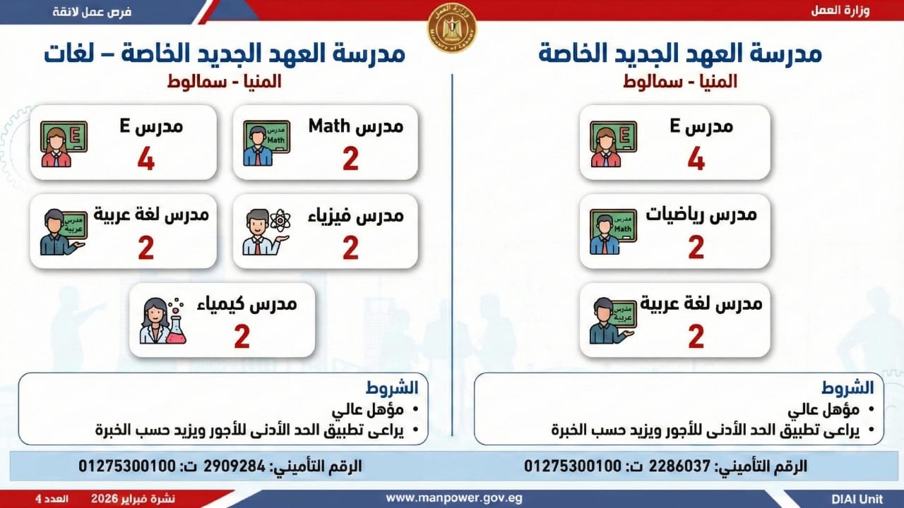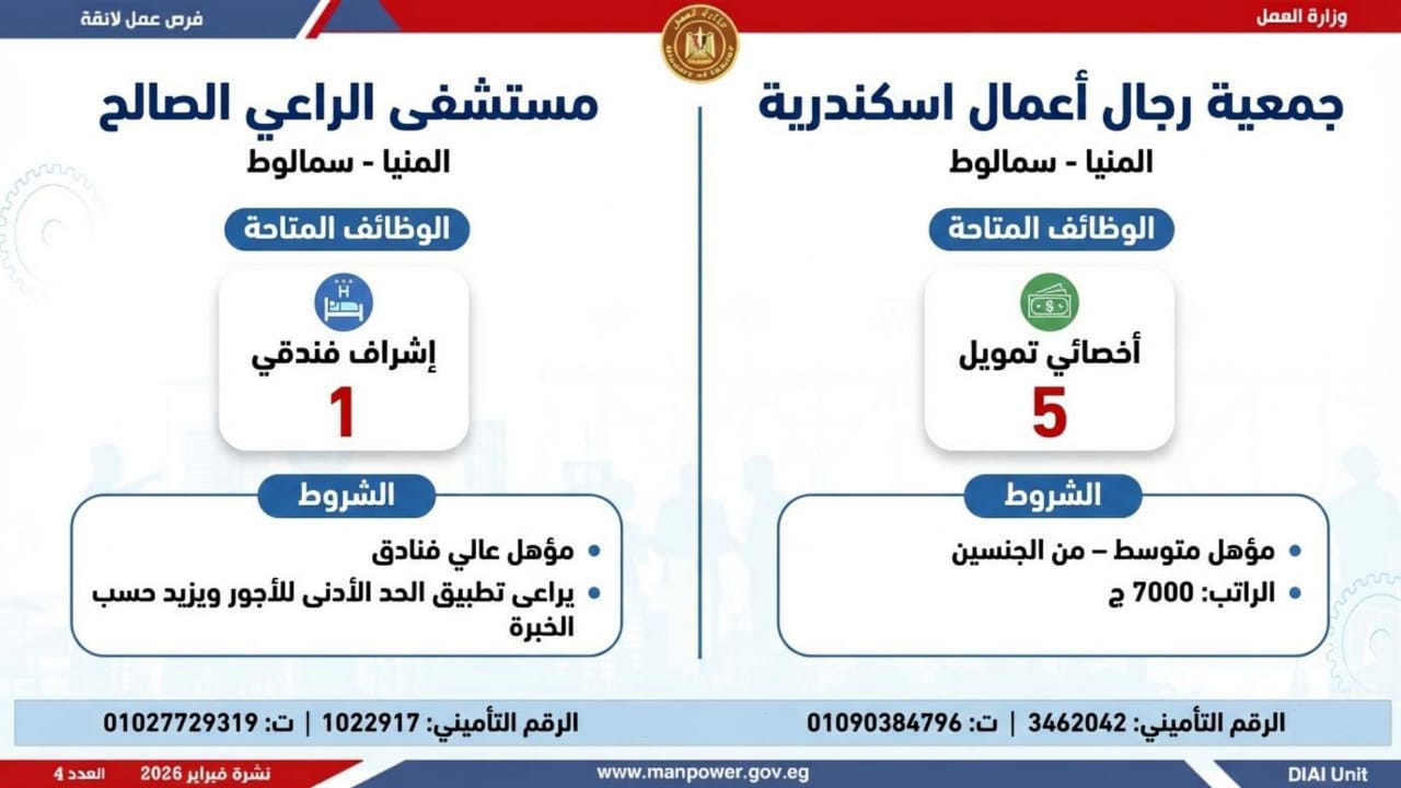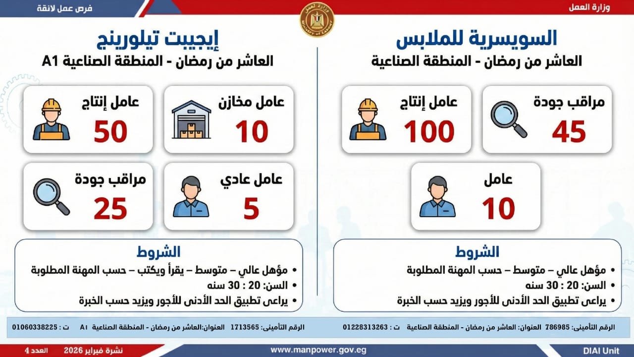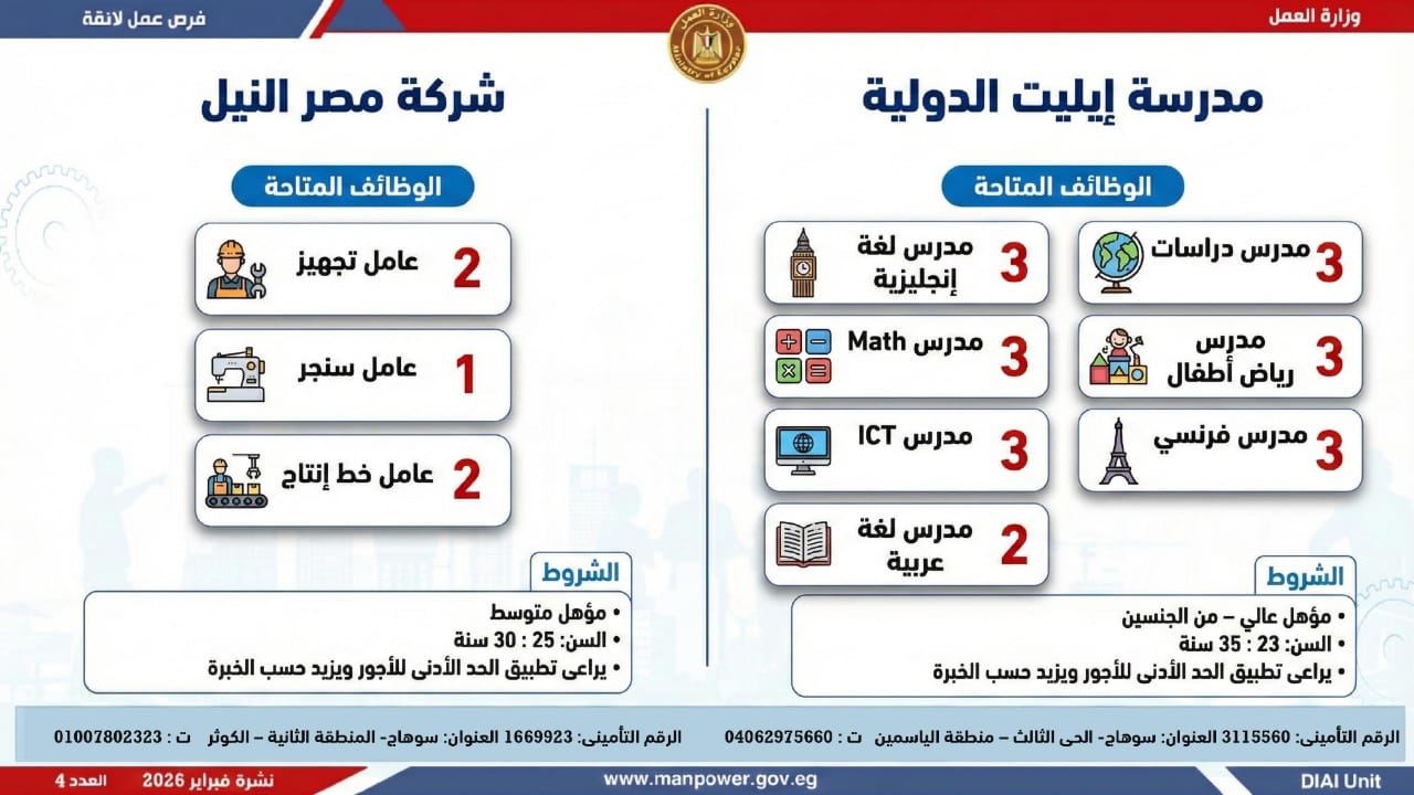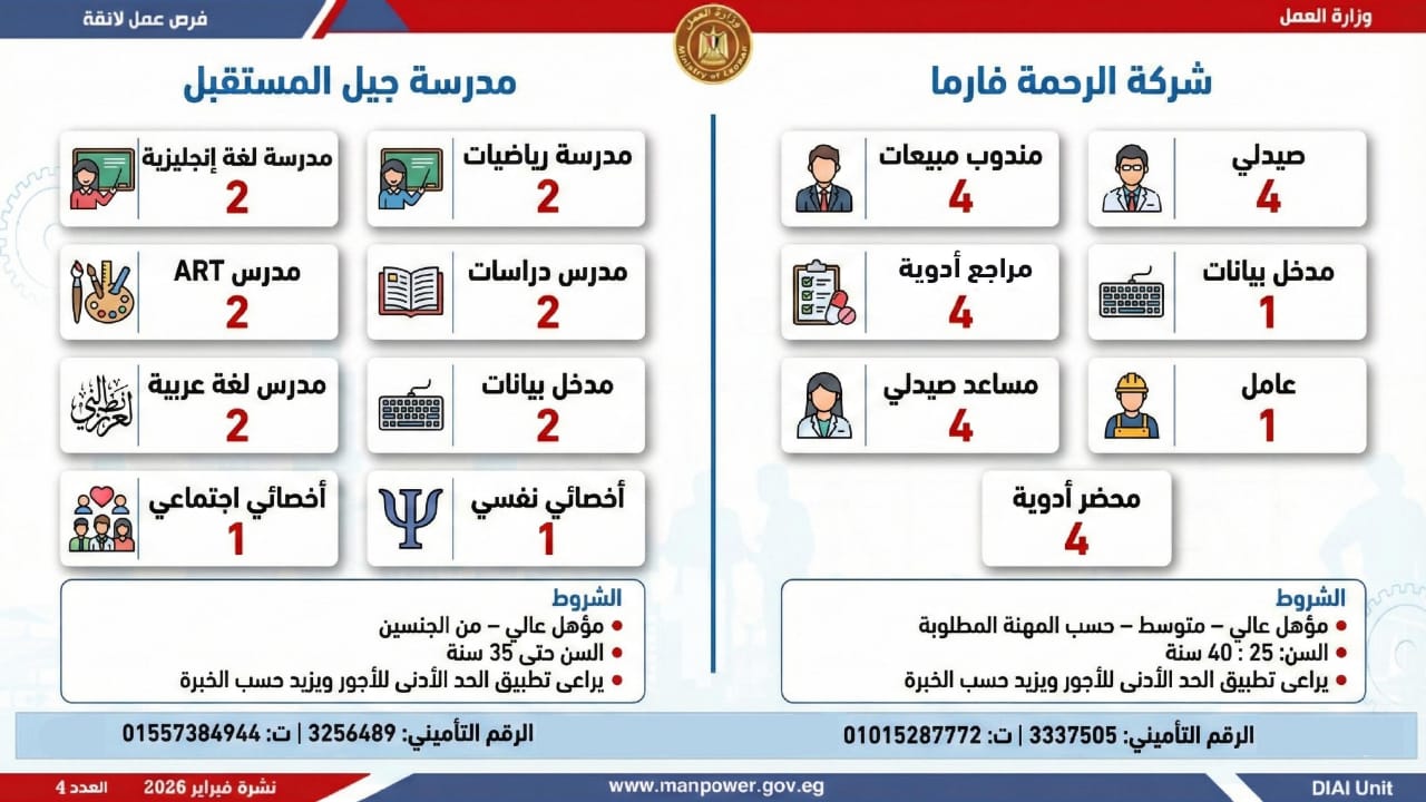 أعلنت وزارة العمل اليوم السبت، عن إطلاق نشرة التوظيف نصف الشهرية الجديدة، التي تتضمن 5456 فرصة عمل جديدة، بالتعاون مع 54 شركة من شركات القطاع الخاص، موزعة على 14 محافظة، مع فتح باب التقديم خلال شهري فبراير ومارس 2026.