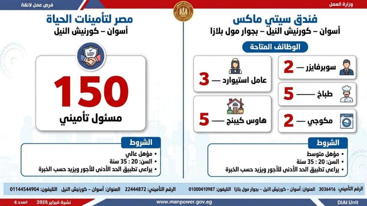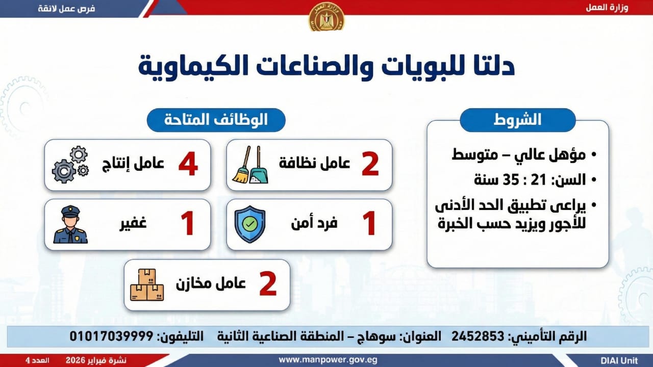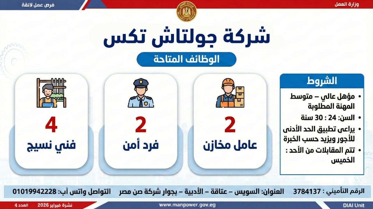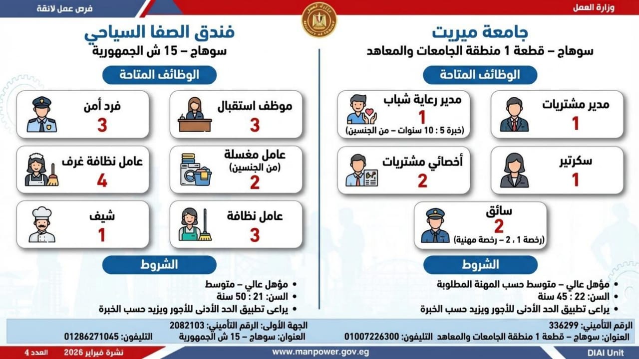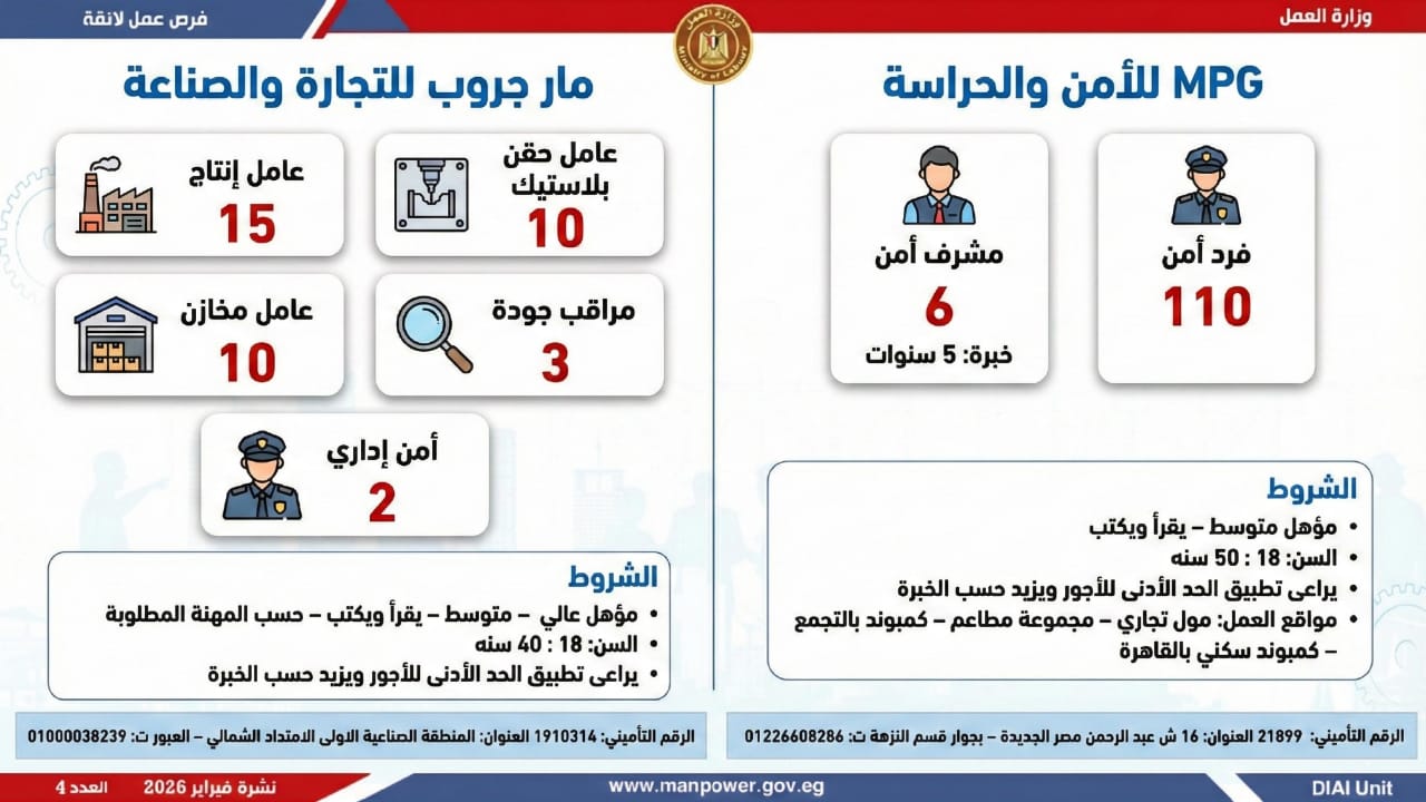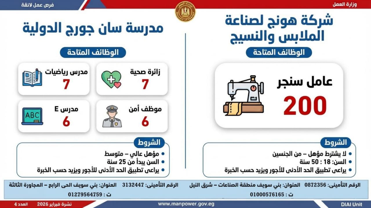 أعلنت وزارة العمل اليوم السبت، عن إطلاق نشرة التوظيف نصف الشهرية الجديدة، التي تتضمن 5456 فرصة عمل جديدة، بالتعاون مع 54 شركة من شركات القطاع الخاص، موزعة على 14 محافظة، مع فتح باب التقديم خلال شهري فبراير ومارس 2026.