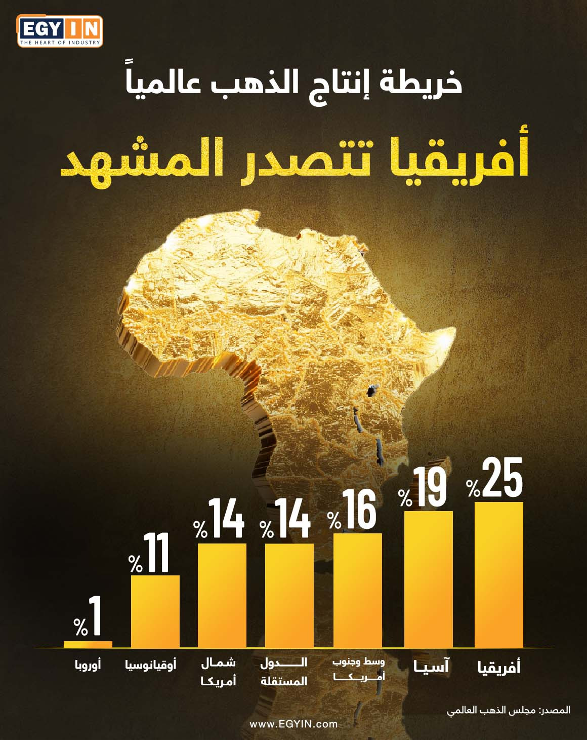 وتستحوذ إفريقيا على 25% من إنتاج الذهب عالميًا، يليها قارة أسيا بحوالي 19%، لتأتي وسط وجنوب أمريكا في المرتبة الثالثة بنحو 16%، فيما بلغت نسبة إنتاج الذهب في الدول المستقلة نحو 14%.