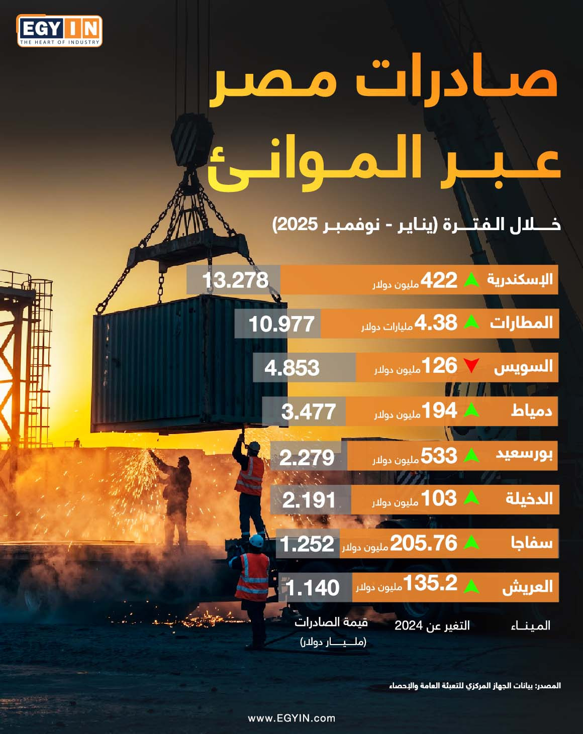 ونستعرض موقع " إيجي إن" من خلال الانفوجراف التالي، صادرات مصر عبر الموانئ خلال الفترة خلال الفترة من يناير وحتى نوفمبر 2025، وجاءت كالتالي: