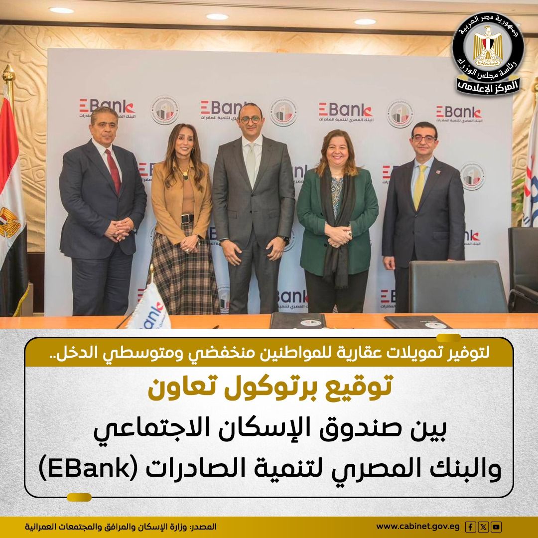 وقّع صندوق الإسكان الاجتماعي ودعم التمويل العقاري، بروتوكول تعاون مع البنك المصري لتنمية الصادرات (EBank)، لتوفير تمويلات عقارية بقيمة 500 مليون جنيه للمواطنين منخفضي ومتوسطي الدخل، بما يسهم في إتاحة خيارات تمويلية متنوعة بشروط ميسرة، ويعزز من استدامة برامج الإسكان الاجتماعي، ويساهم أيضًا في توسيع قاعدة المستفيدين من خدمات التمويل العقاري وتحقيق تطلعاتهم في امتلاك سكن مناسب.