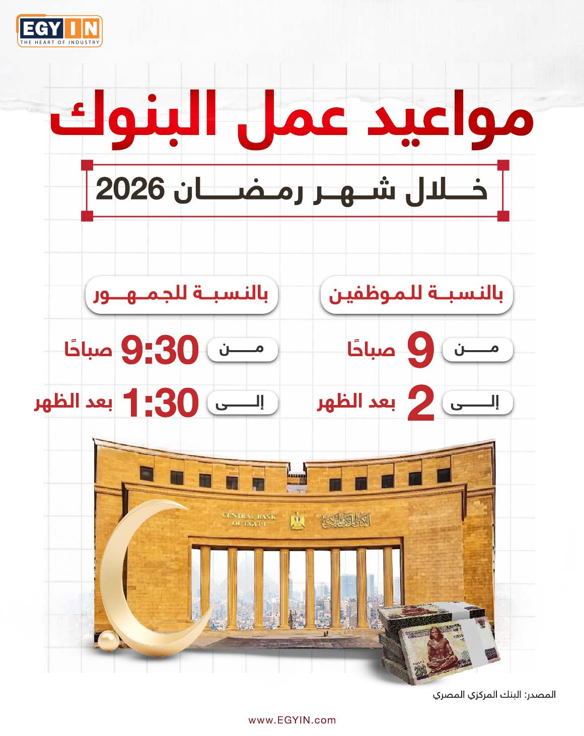 يأتي ذلك بالتزامن مع زيادة عمليات البحث من عملاء البنوك عن مواعيد عمل البنوك العاملة في السوق خلال شهر رمضان المبارك 2026، ويستعرض موقع «إيجي إن» باقي المواعيد خلال الشهر، إذ يحرص البنك المركزي المصري على تلبية احتياجات العملاء، من خلال تعديل مواعيد العمل، لإتمام عملياتهم المصرفية.