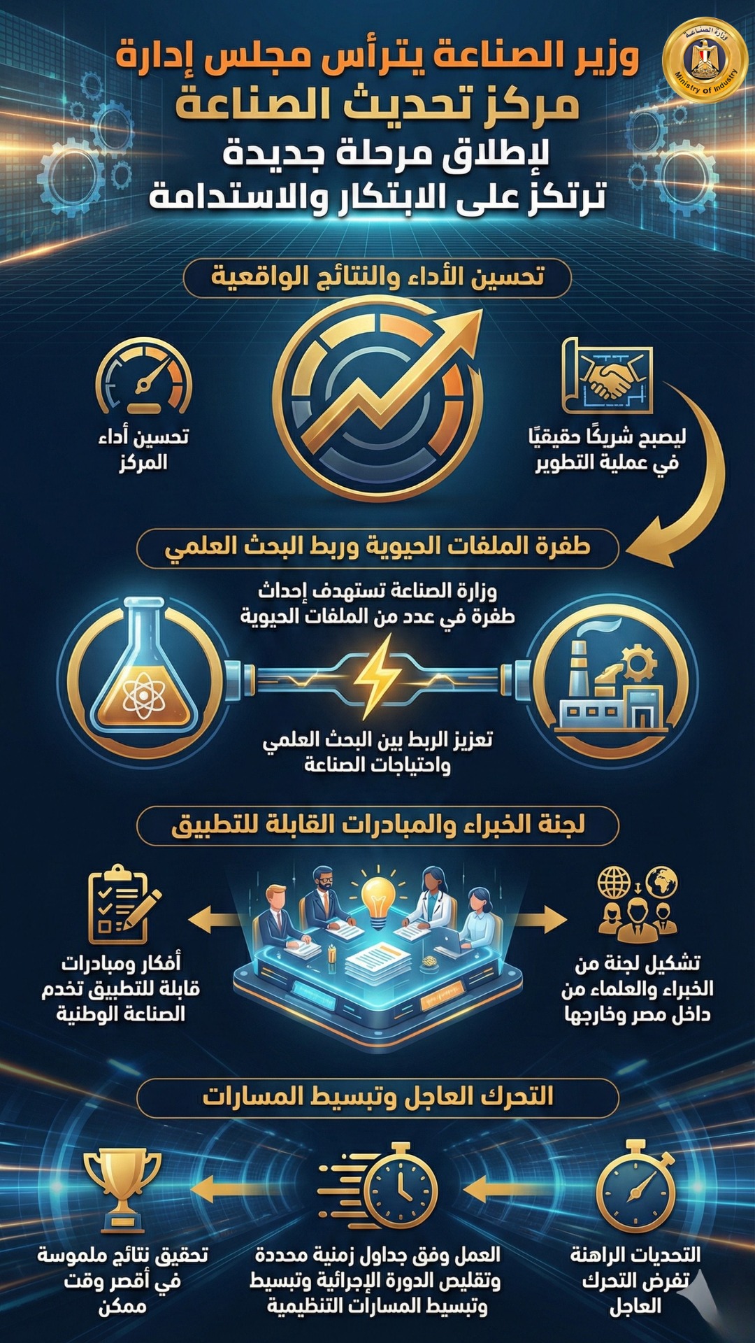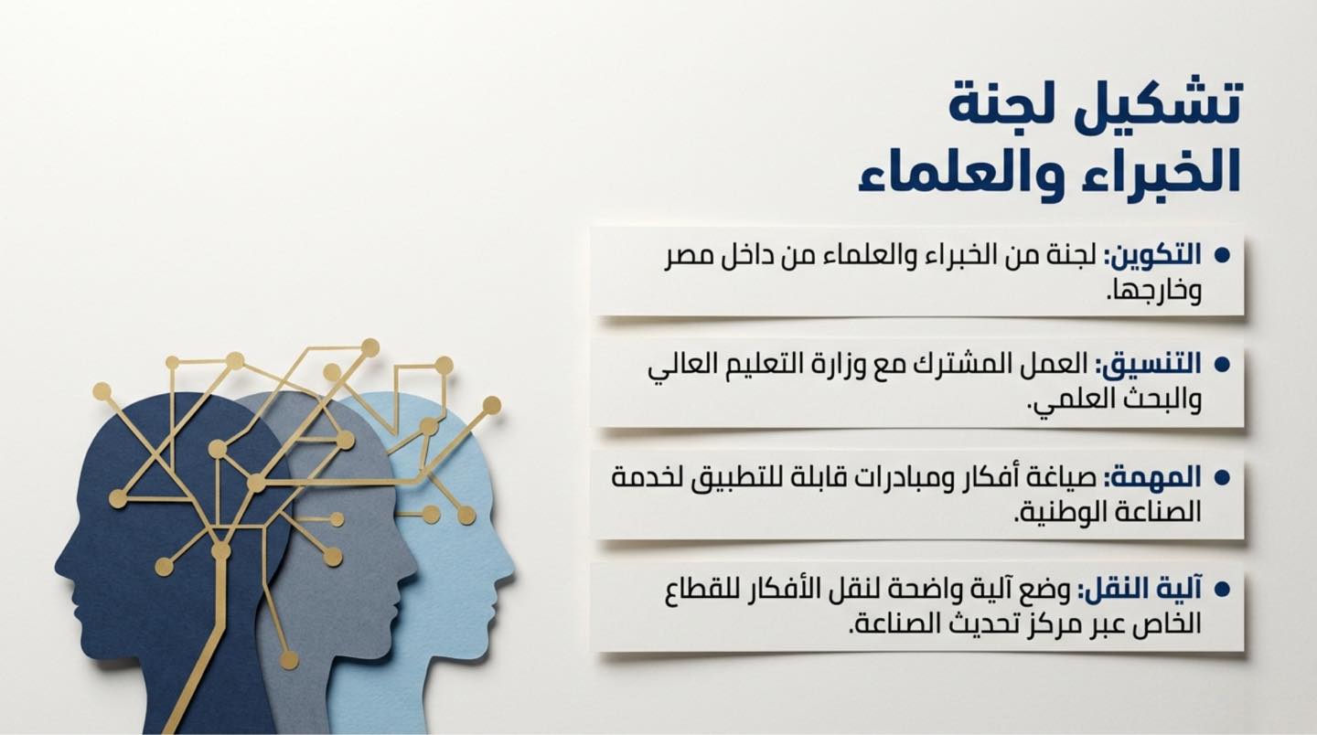 ولفت الوزير إلي أن تشكيل لجنة من الخبراء والعلماء من داخل مصر وخارجها، بالتنسيق مع وزارة التعليم العالي والبحث العلمي، بهدف صياغة أفكار ومبادرات قابلة للتطبيق تخدم الصناعة الوطنية، ووضع آلية واضحة لنقل تلك الأفكار إلى القطاع الخاص من خلال مركز تحديث الصناعة، بما يحقق التكامل بين البحث العلمي والتطبيق الصناعي.