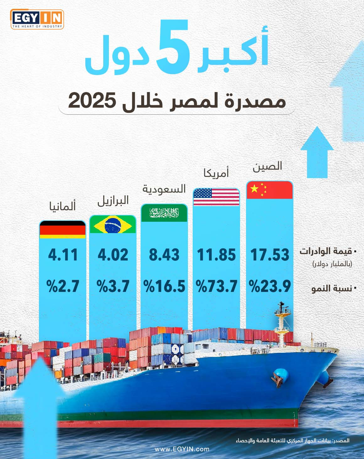 ويستعرض موقع "إيجي إن" من خلال الإنفوجراف التالي، ترتيب أكبر خمسة دول مصدرة لمصر خلال 11 شهرًا من عام 2025، وهو:-