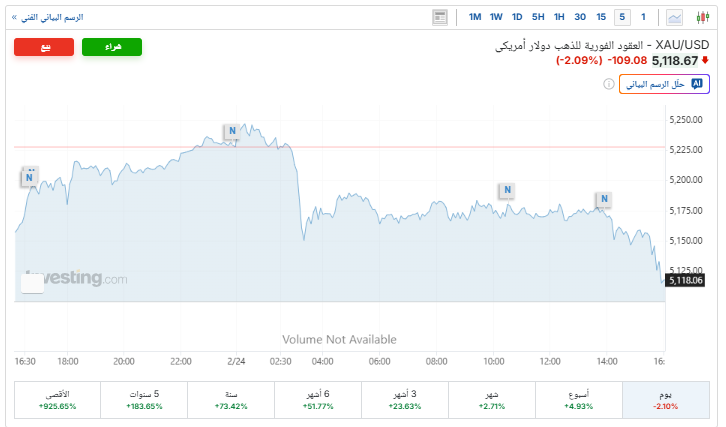 وانخفضت الأسعار الفورية للذهب بنسبة 2.09%، ليتم تداولها حاليًا عند 5118 دولارًا للأوقية، بعدما افتتحت التداولات عند 5227 دولارًا، مسجلة أعلى مستوى لها اليوم عند 5249 دولار، بعدما سجل أعلى مستوى له على الإطلاق عند 5,595 دولارًا في 29 يناير الماضي، بحسب موقع «إنفيستينج».