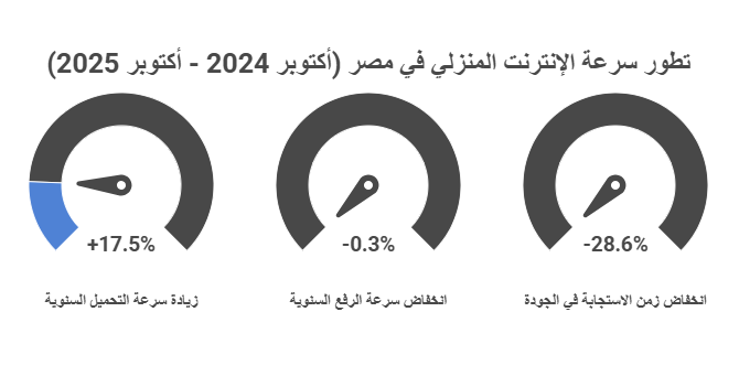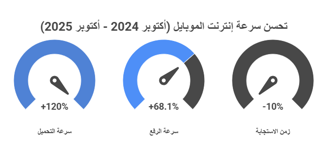 وكشف التقرير أن إنترنت الموبايل في مصر سجل سرعة تحميل 56.45 ميجابايت/ ثانية للفترة من أكتوبر 2024 وحتى أكتوبر 2025 بزيادة 120% عن العام الذي يبدأ من أكتوبر 2023 حتى أكتوبر 2024، بينما سجلت سرعة الرفع 10.27 ميجابايت/ثانية لنفس الفترة المذكورة (أكتوبر 2024 - أكتوبر 2025) ، بزيادة 68.1% عن العام الذي يسبقه، وسجل زمن الاستجابة حوالي 27 مللي ثانية، بتحسن واضح بنسبة 10%، فكلما قل زمن الاستجابة يدل على قوة وسرعة الإنترنت.