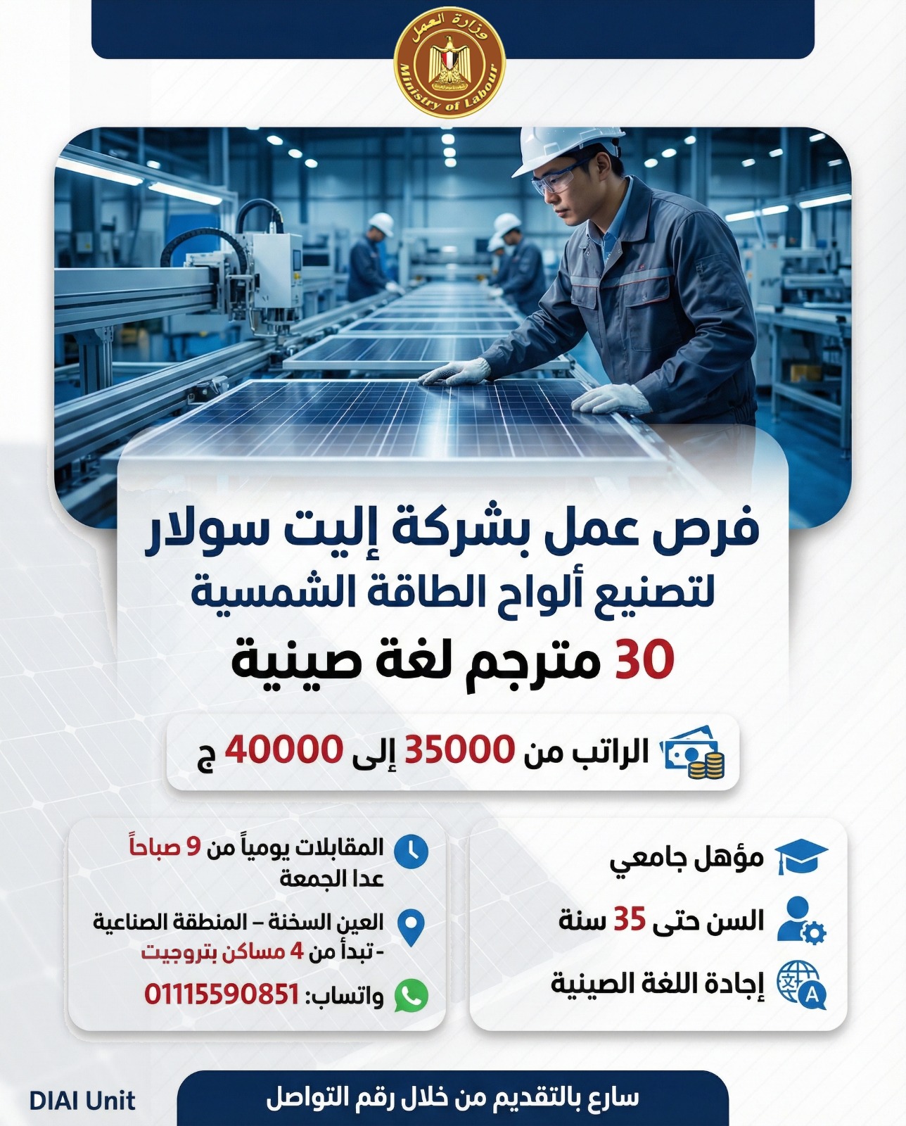 أعلنت وزارة العمل، توفير فرص جديدة للشباب الراغبين في العمل بقطاع الطاقة المتجددة، وطلبت شركة "إليت سولار" (Elite Solar) المتخصصة في تصنيع ألواح الطاقة الشمسية بمنطقة العين السخنة، 30 مترجم لغة صينية.