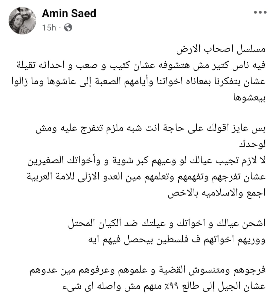 في النهاية، مسلسل "صحاب الأرض" حقق معادلة صعبة الدراما أثبتت أن الدراما قادرة على أن تكون أكثر من مجرد حكاية تُروى على الشاشة، فلم يقتصر العمل على توثيق تداعيات حرب 7 أكتوبر، لكنه عرض رؤية إنسانية عميقة لمعاناة أهل غزة، وفي الوقت ذاته أبرز الدور المصري سياسيًا وإغاثيًا بصورة متوازنة ومدروسة، ليصبح صحاب الأرض عملًا لا يقاس فقط بنسبة المشاهدة، بل بقيمته الفنية والإنسانية، وبقدرته على تسليط الضوء على فلسطين ومعاناة غزة، مؤكدًا على أن الفن حين ينحاز للحقيقة، يصل إلى القلب قبل الشاشة.