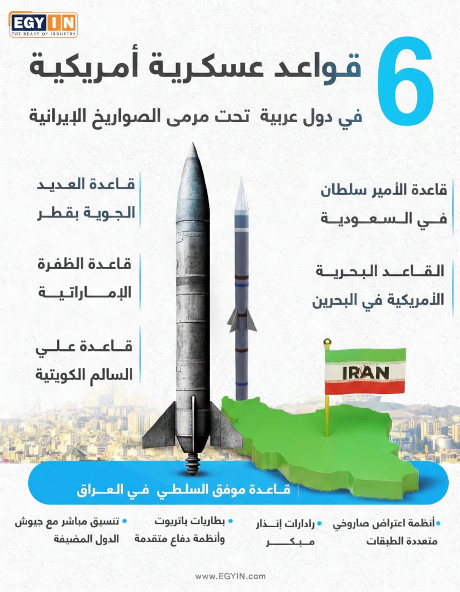 6 قواعد عسكرية أمريكية في دول عربية تحت مرمى الصواريخ الإيرانية (انفوجراف)