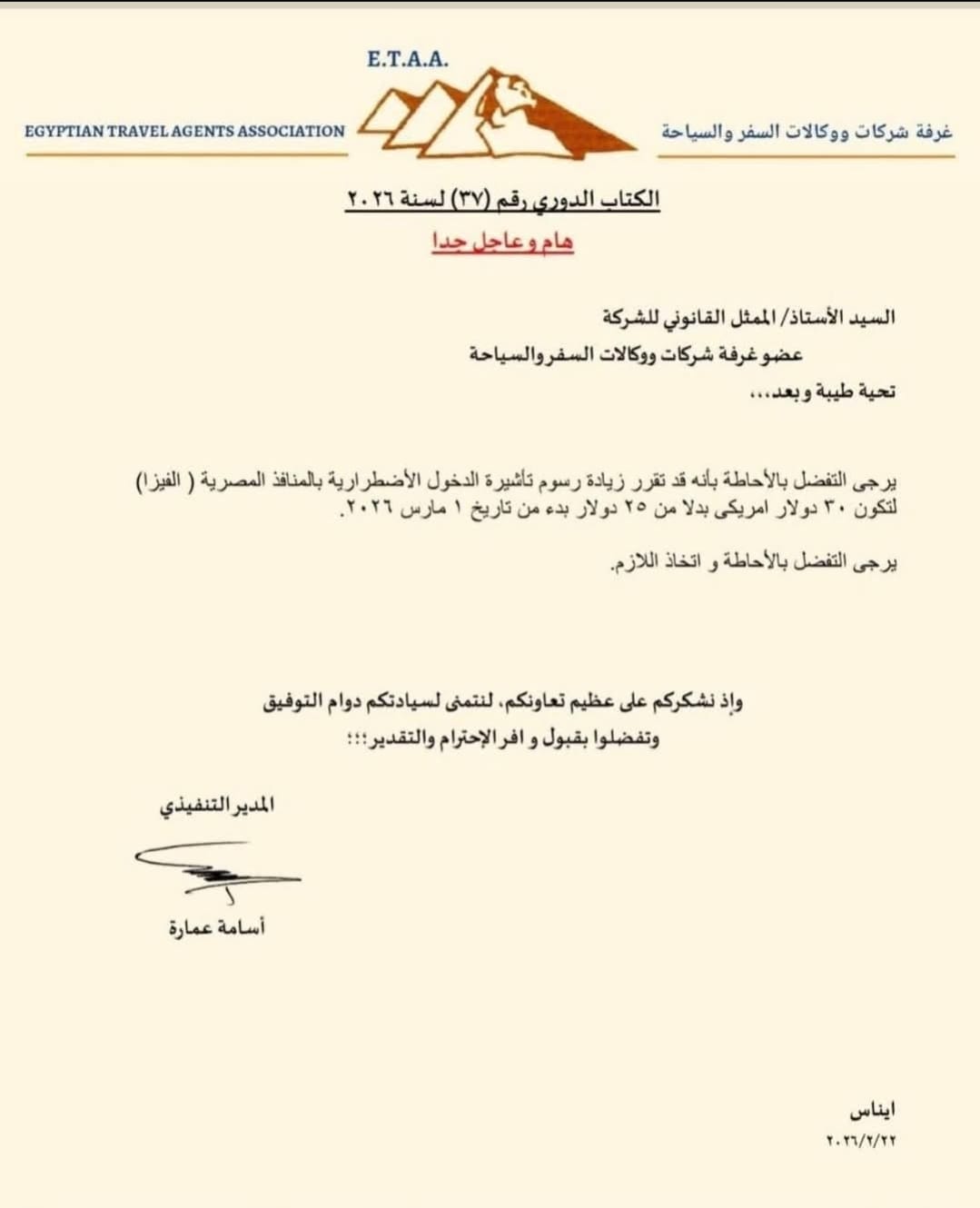 ووفقًا لمنشور صادر عن غرفة شركات السياحة، نوهت فيه عن قرار زيادة رسوم تأشيرة الدخول الاضطرارية بالمنافذ المصرية على أعضائها، والتي وصلت لـ 30 دولارا تطبق من اليوم الأحد 1 مارس بديلاً من الـ 25 دولارا.