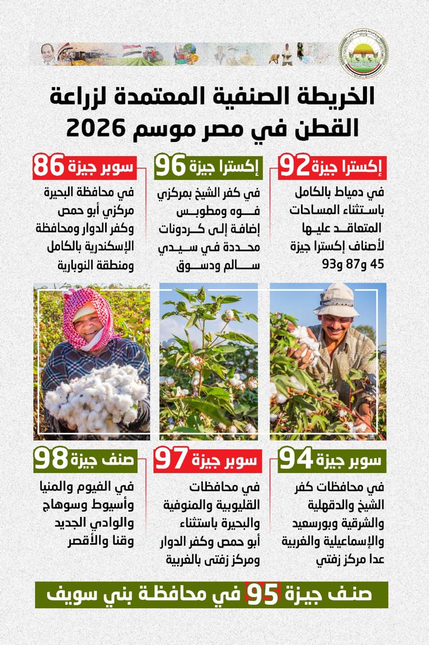 كشفت وزارة الزراعة واستصلاح الأراضي، عن الخريطة الصنفية المعتمدة لمحصول القطن لموسم 2026، والتي أعدها معهد بحوث القطن التابع لمركز البحوث الزراعية، بالتنسيق مع المعاهد البحثية المعنية، وذلك في إطار خطة الوزارة لاستعادة العرش العالمي للمحصول الاستراتيجي، تنفيذًا لتوجيهات علاء فاروق، وزير الزراعة واستصلاح الأراضي، وتحت إشراف الدكتور عادل عبدالعظيم رئيس مركز البحوث الزراعية.