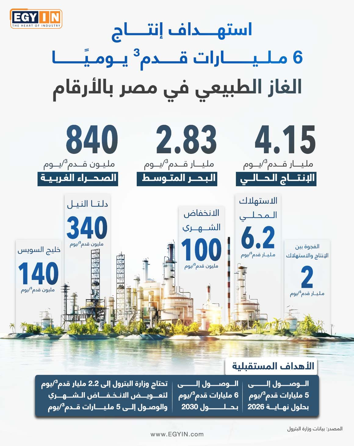 تخطط وزارة البترول والثروة المعدنية، للوصول إلى 6 مليارات قدم مكعبة يوميًا بحلول 2030، ضمن خطة الحكومة لتعزيز استقرار الإنتاج في السوق المحلية، فيما تعول الوزارة على عدة مؤشرات لتحقيق هدفها.