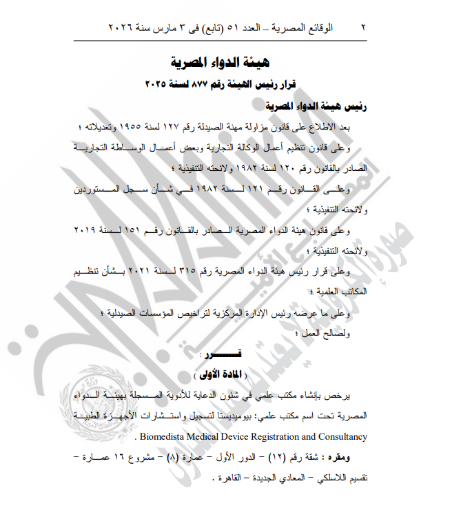 نشرت الجريدة الرسمية اليوم، القرار الصادر من رئيس هيئة الدواء المصرية، والذي يحمل رقم 877 لسنة 2025، وجاء في مادته الأولى، أن يرخص بإنشاء مكتب علمي في شئون الدعاية للأدوية المسجلة بهيئة الدواء المصرية.