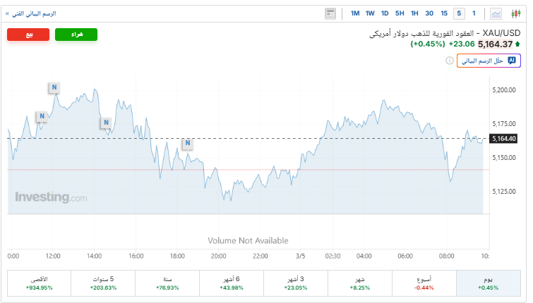 وارتفعت الأسعار الفورية للذهب بنسبة 0.4%، ليتم تداولها حاليًا عند 5,164 دولارًا للأوقية، بعدما افتتحت التداولات عند 5,141 دولار، مسجلةً أعلى مستوى لها اليوم عند 5,195 دولار، بعدما أن سجل أعلى مستوى له على الإطلاق عند 5,595 دولارًا في الـ29 من يناير الماضي، بحسب موقع «إنفيستينج».
