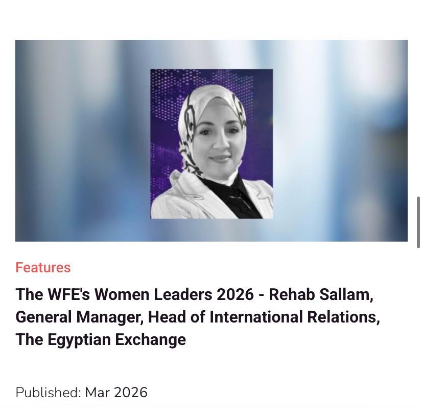 أعلن الاتحاد العالمي للبورصات لقائمة القيادات النسائية الأكثر تأثيرًا في صناعة أسواق المال عالميًا، إذ ضمت القائمة رحاب سلام، مدير عام العلاقات الدولية بـ البورصة المصرية، ممثلةً عن البورصة المصرية، وذلك ضمن 20 قيادة تنفيذية من مختلف البورصات حول العالم.