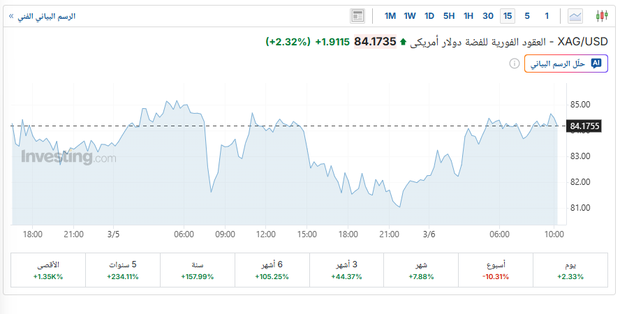 وافتتح سعر أونصة الفضة العالمية تداولات اليوم على ارتفاع طفيف بنسبة 2.49 %، لتتراجع عن حاجز 85 دولارا مرة أخرى وتتداول الآن عند المستوى 84.171 دولار للأوقية، بعدما افتتحت تداولات اليوم عند المستوى 83.53 دولار للأوقية، وسط ترقب المزيد من التقلبات مع التوترات بين الولايات المتحدة وإيران، وفقًا لموقع "إنفستينج".