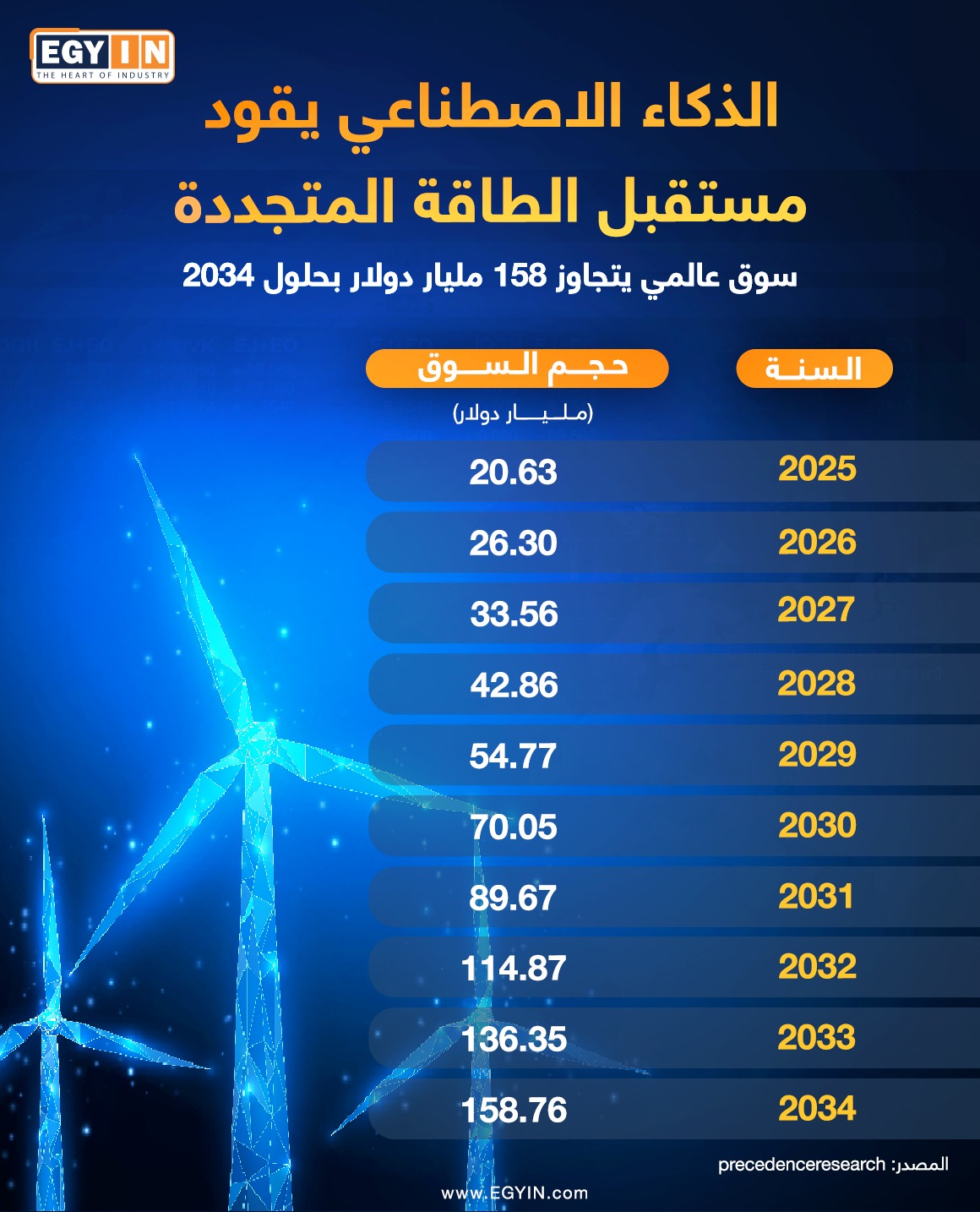 AI يقود مستقبل الطاقة المتجددة، سوق عالمي يتجاوز 158 مليار دولار بحلول 2034