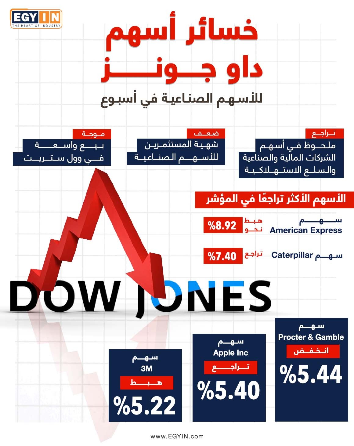 خسائر كبرى الشركات الصناعية في مؤشر «داو جونز» خلال أسبوع الحرب (إنفوجراف)