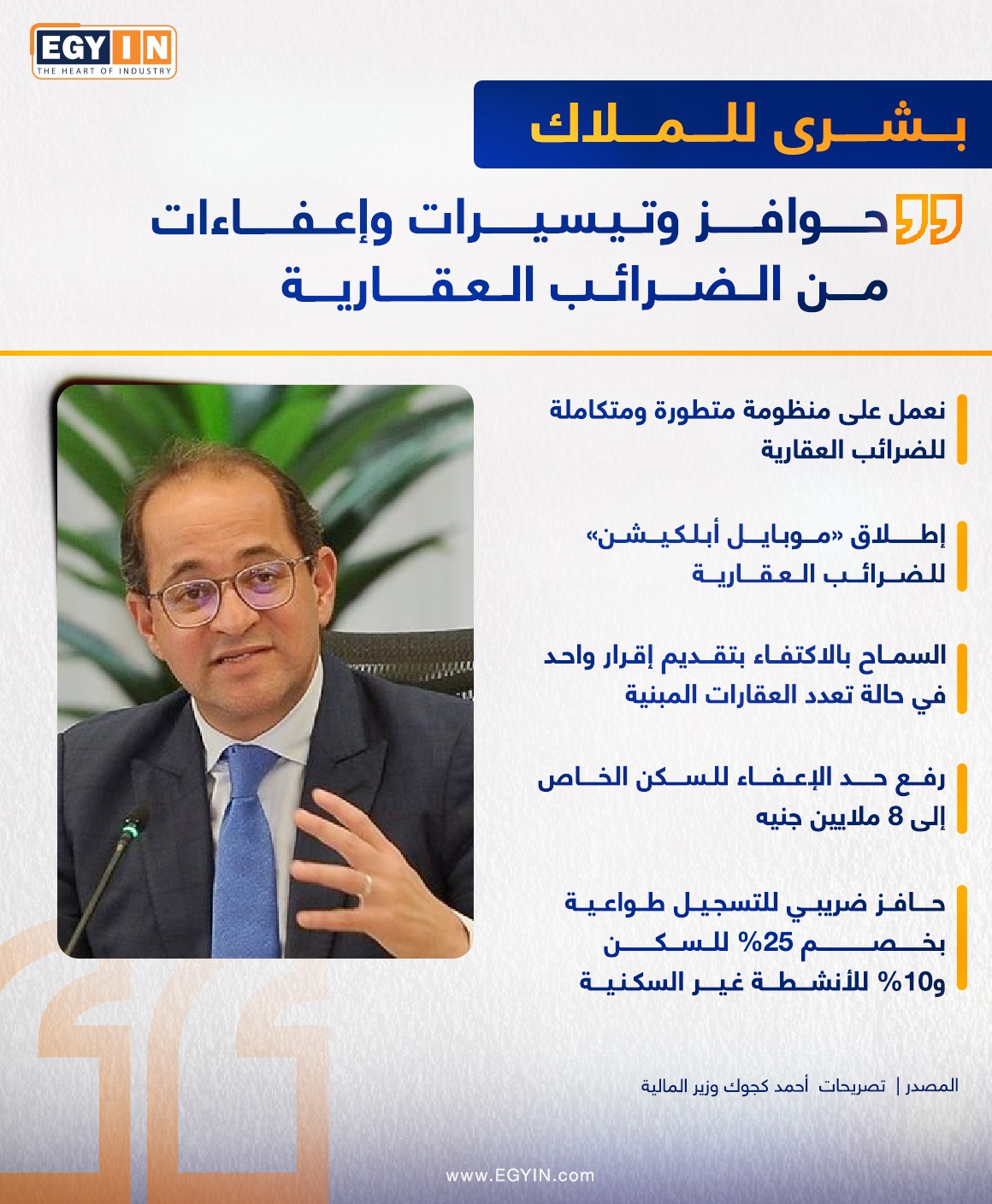 أشار كجوك، إلى أنه سيتم السماح بالاكتفاء بتقديم إقرار واحد في حالة تعدد العقارات المبنية، والتعامل من خلال مأمورية واحدة أيضًا، لافتًا إلى أنه سيتم رفع حد الإعفاء للسكن الخاص إلى 8 ملايين جنيه، وتقديم حافز ضريبي لمن سيتقدم بالتسجيل طواعية بخصم 25% للسكن و10%٪ للأنشطة غير السكنية.