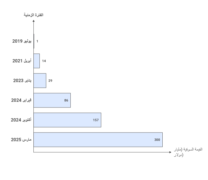 وفقًا لنيويورك تايمز، تبلغ قيمة شركة Open Al حوالي 300 مليار دولار، وفقًا لآخر تحديث في مارس 2025، بعد جولة تمويلية بقيمة 40 مليار دولار، ساعدت الشركة على الوصول إلى هذه القيمة الحالية، ونوضح من خلال الإحصائية التالية تسلسل زمني يوضح ارتفاع قيمة الشركة في السنوات الأخيرة.