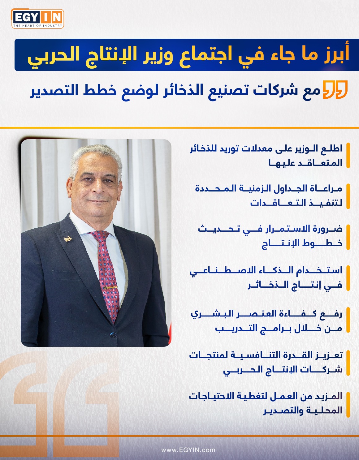 وزير الإنتاج الحربي يوجه بتحديث خطوط إنتاج الذخائر وتعزيز التصدير (إنفوجراف)