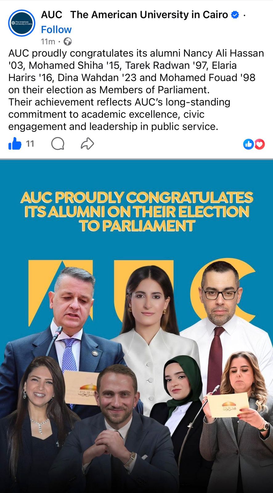 نشرت الجامعة الأمريكية بالقاهرة (AUC) عبر حسابها الرسمي على موقع التواصل الاجتماعي منشورًا تهنئ فيه عددًا من خريجيها بعد انتخابهم أعضاءً في مجلس النواب، في خطوة تعكس حضور خريجي الجامعة في مواقع التأثير في الحياة العامة والعمل التشريعي في مصر.