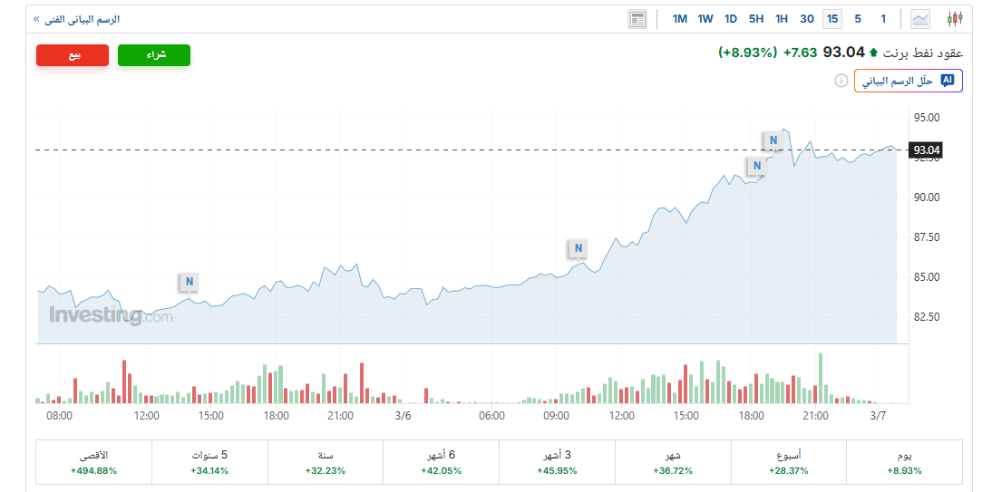 ومنذ الهجوم الأمريكي على إيران، وأسعار النفط ترتفع بسرعة، حتى أن سعر خام برنت سجل اليوم 93.04 دولار للبرميل الواحد، مسجلًا أعلى زيادة له منذ عام 2022 حينما تجاوز سعر البرميل 115 دولار.