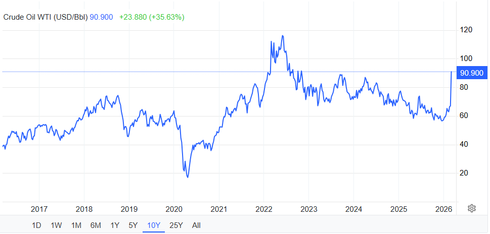 لقد سجل سعر البرميل اليوم زيادة بنسبة 8.93% مقارنة بيوم الجمعة الموافق 6 مارس، الذي اقترب فيه سعر النفط تسجيل 91 دولار للبرميل الواحد ، بزيادة أسبوعية منذ بداية الحرب 28.37% وفقًا لإحصائيات موقع investing.