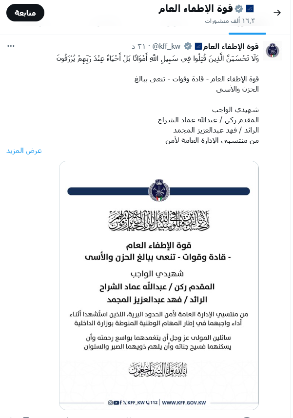 وجاء في المنشور أنها "تنعى ببالغ الحزن والأسى شهيدي الواجب المقدم ركن عبدالله عماد الشراح، الرائد فهد عبدالعزيز المجمد من منتسبي الإدارة العامة لأمن الحدود البرية، اللذين استُشهدا أثناء أداء واجبهما في إطار المهام الوطنية المنوطة بوزارة الداخلية".