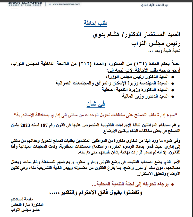 طلب إحاطة بشأن تعطيل التصالح في تحويل الوحدات السكنية إلى إدارية بالإسكندرية
