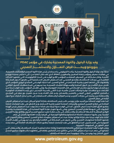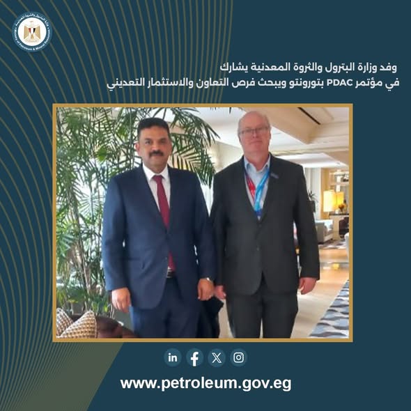 شارك وفد وزارة البترول والثروة المعدنية، برئاسة الجيولوجي ياسر رمضان رئيس هيئة الثروة المعدنية والصناعات التعدينية، في فعاليات معرض ومؤتمر رابطة المنقبين والمطورين (PDAC)، الذي عُقد خلال الفترة من 1 إلى 4 مارس بمدينة تورونتو الكندية.