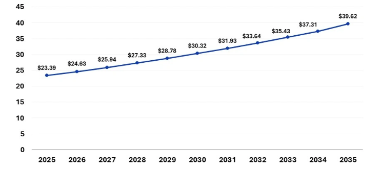 يظهر الرسم البياني نموًا تدريجيًا ومستمرًا في سوق خطوط وأبراج نقل الطاقة في آسيا خلال الفترة من 2025 إلى 2035، حيث يرتفع حجم السوق من حوالي 23.39 مليار دولار في 2025 إلى نحو 39.62 مليار دولار في 2035، أي بزيادة إجمالية تقارب 16.23 مليار دولار خلال عشر سنوات.