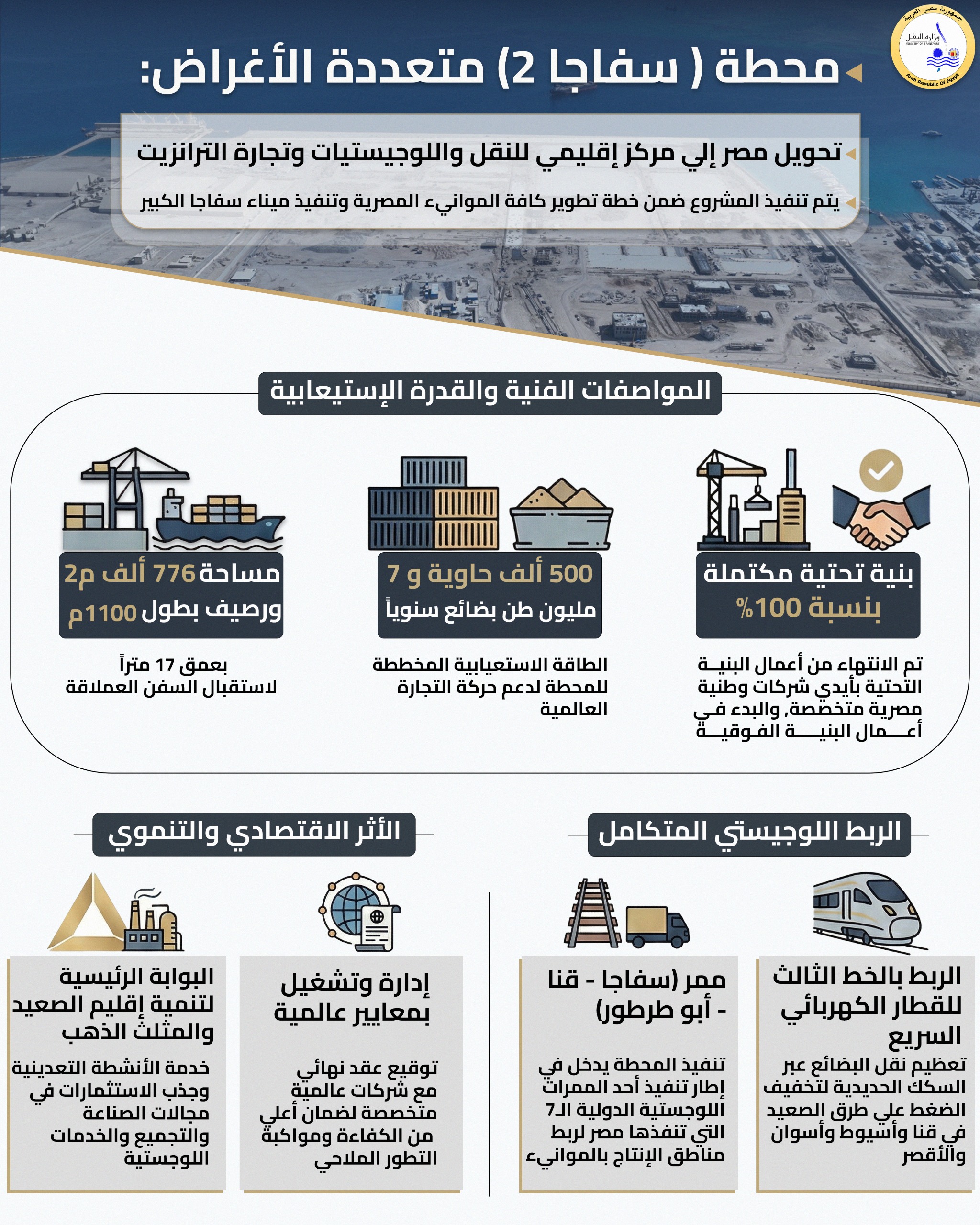 تنفذ وزارة النقل، مشروع المحطة متعددة الأغراض “سفاجا 2” بميناء سفاجا، ضمن خطة تنفيذ ميناء سفاجا الكبير وفي إطار تنفيذ وزارة النقل لتطوير كافة الموانئ المصرية، بهدف تحويل مصر إلى مركزٍ إقليمي للنقل واللوجيستيات وتجارة الترانزيت، وذلك تنفيذا لتوجيهات الرئيس عبد الفتاح السيسي رئيس الجمهورية.