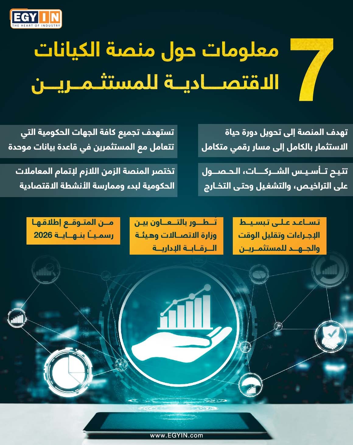 ويستعرض موقع إيجي إن من خلال الإنفوجراف التالي، 7 معلومات حول منصة الكيانات الاقتصادية للمستثمرين، وفقًا لما ذكرته وزارة الاستثمار والتجارة الخارجية، وهي: