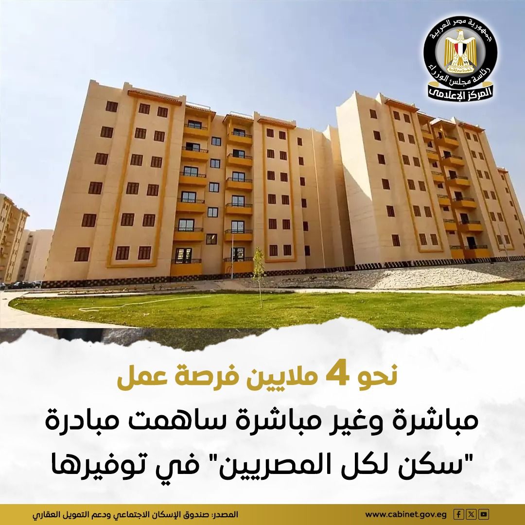 أكد المركز الإعلامي لمجلس الوزراء، أن مبادرة "سكن لكل المصريين"، ساهمت في إحداث نقلة نوعية في سوق العمل، حيث وفرت نحو 4 ملايين فرصة عمل، منها 1.35 مليون فرصة عمل مباشرة، و2.6 مليون فرصة عمل غير مباشرة.