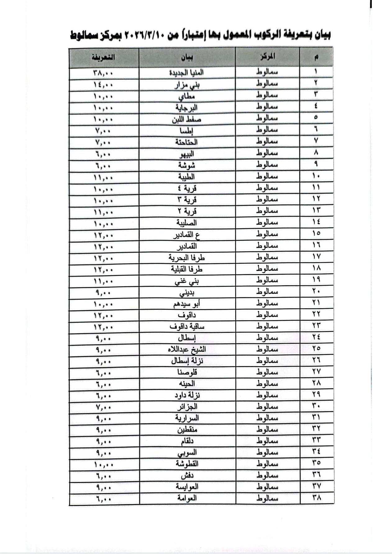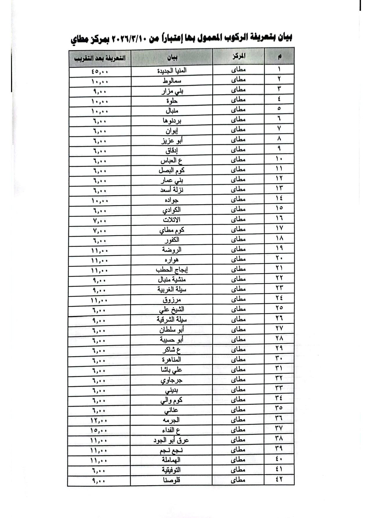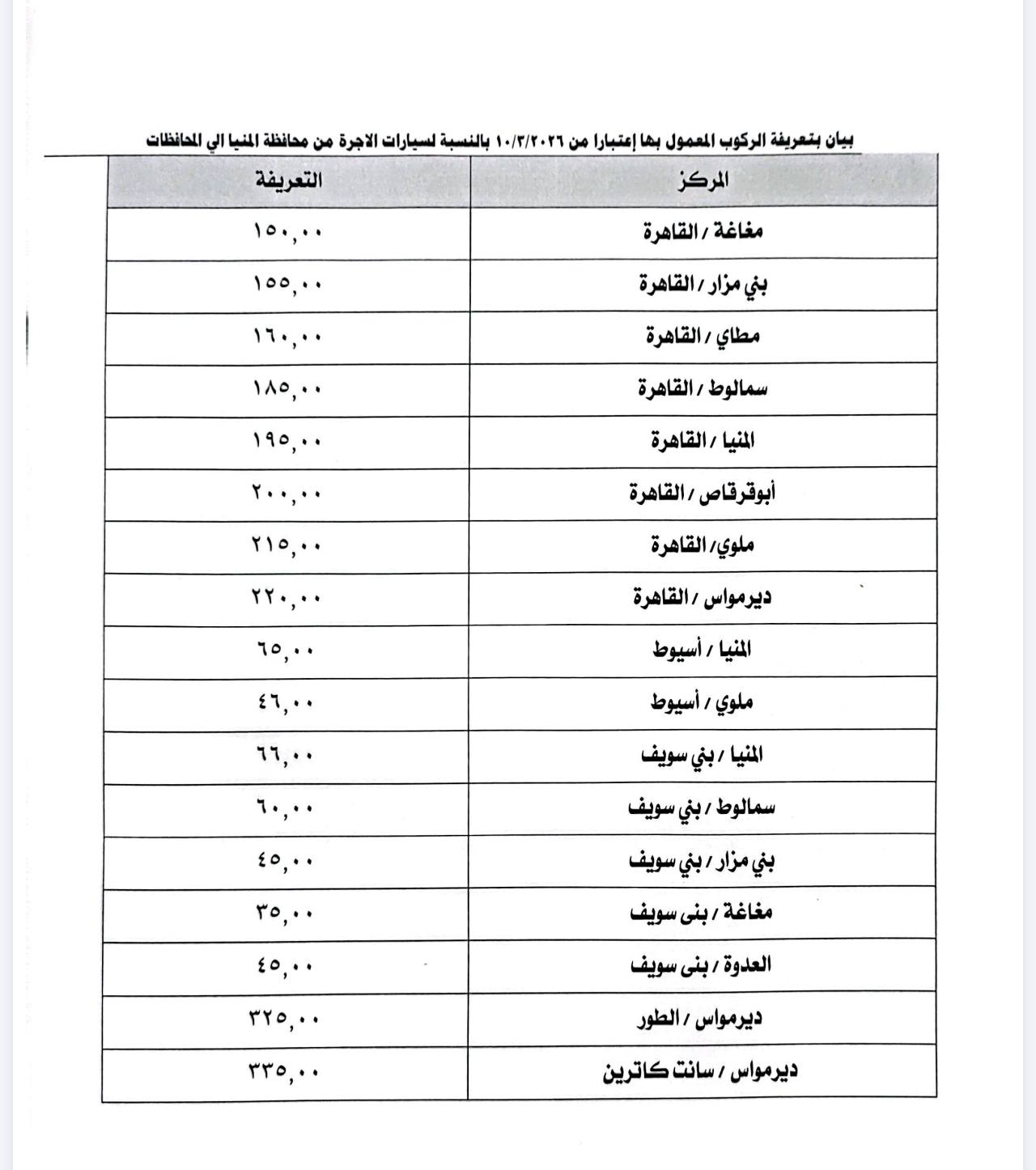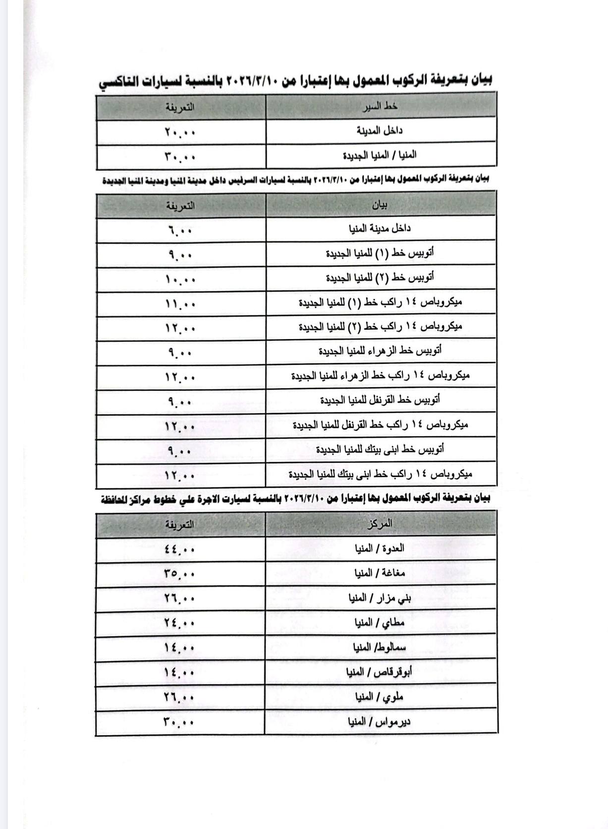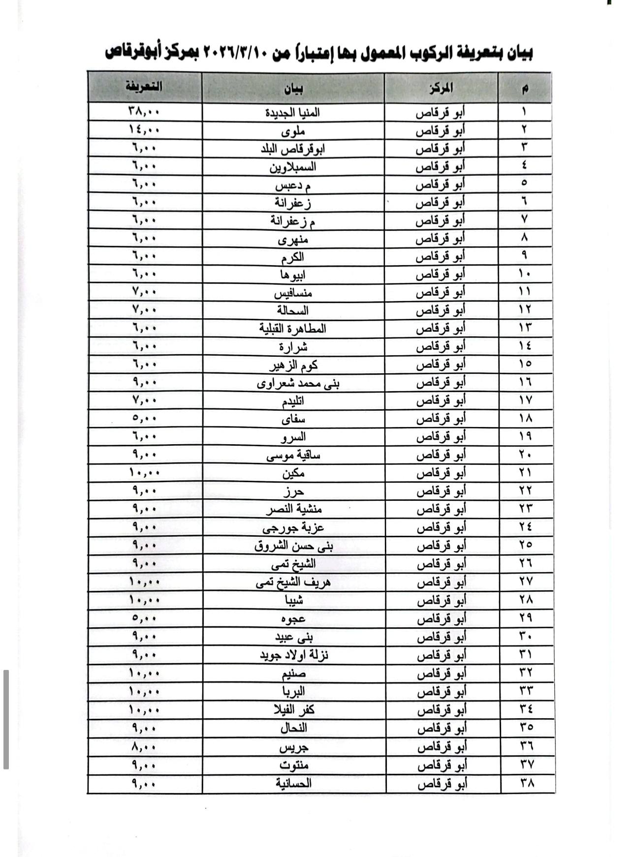 أعلنت محافظة المنيا تعريفة المواصلات الجديدة لسيارات الأجرة وخطوط النقل الداخلي والخارجي بجميع مراكز المحافظة، عقب قرار تعديل أسعار المنتجات البترولية، في إطار ضبط منظومة النقل ومنع أي استغلال للمواطنين.