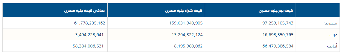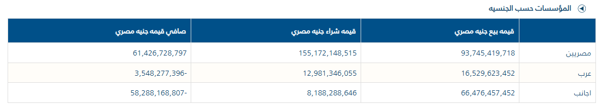 واتجهت المؤسسات الأجنبية إلى البيع بقيمة 58.288 مليار جنيه، فيما بلغ صافي بيع المؤسسات العربية ما قيمته 3.548 مليار جنيه، واتجهت صافي مشتريات المؤسسات المصرية نحو 61.426 مليار جنيه.