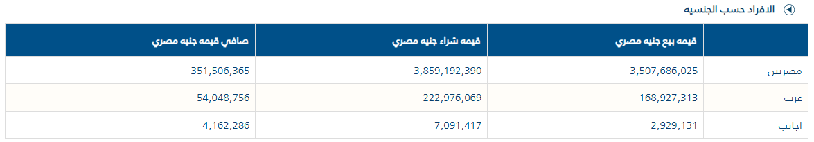 وسجل الأفراد المصريين والعرب صافي شراء بقيمة 351.506 مليون جنيه و54.048 مليون جنيه، والأجانب صافي شراء 4.162 مليون جنيه.