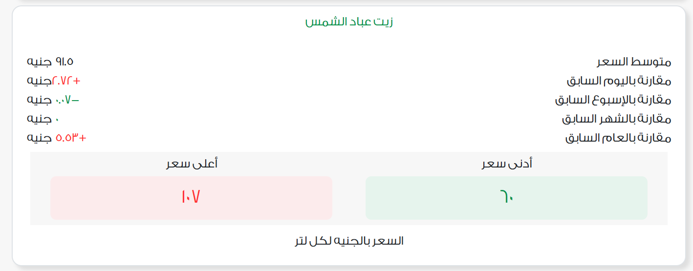 سجل متوسط سعر لتر زيت عباد الشمس نحو 91.5 جنيه، بزيادة قدرها 3 جنيهات مقارنة بالسعر السابق، فيما تراوحت أسعار زيت عباد الشمس في الأسواق بين 60 و107 جنيهات للتر.