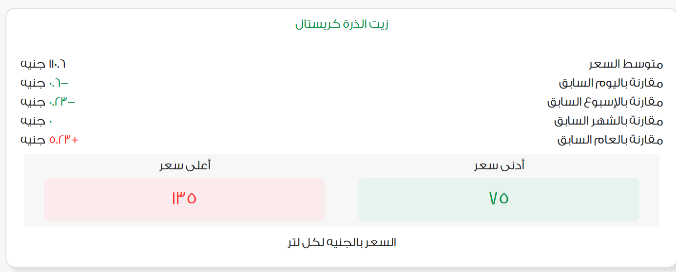 أما زيت الذرة كريستال فقد سجل متوسط سعر اللتر نحو 110.5 جنيه، بانخفاض قدره 50 قرشًا عن السعر السابق، بينما تراوحت أسعاره في الأسواق بين 75 و135 جنيهًا للتر.