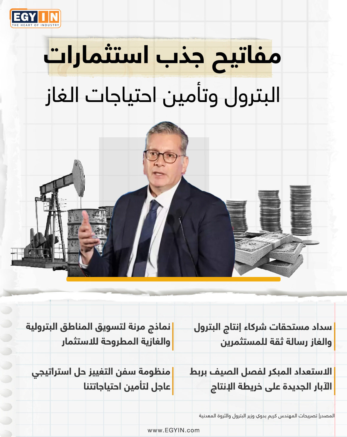 وينشر موقع «إيجي إن» إنفوجراف حول أبرز مفاتيح جذب استثمارات البترول وتأمين احتياجات الغار الطبيعي.