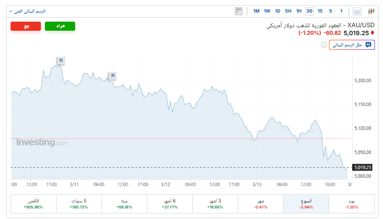 استقر سعر الذهب خلال تداولات اليوم السبت 14 مارس 2026، تزامناً مع العطلة الأسبوعية للبورصات العالمية، وذلك بعد أن حققت خسارة ملحوظة في جلسة ختام تداولات الأسبوع بنسبة 1.2%، محققة خسارة أسبوعية للأسبوع الثاني على التوالي بنسبة 2.9%، متأثرة بارتفاع الدولار ومخاوف التضخم الناجمة عن الحرب في إيران، التي كان لها تأثير سلبي على توقعات خفض أسعار الفائدة.