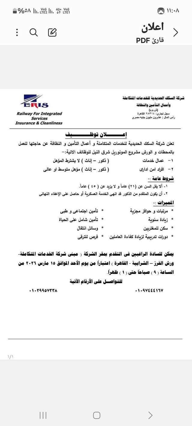 ودعت الشركة الراغبين في التقدم للوظائف إلى الحضور لمقرها الكائن في ورش الفرز بالشرابية – القاهرة (مبنى شركة الخدمات المتكاملة)، اعتباراً من يوم الأحد الموافق 15 مارس 2026، وذلك يومياً من الساعة 9 صباحاً حتى 1 ظهراً.