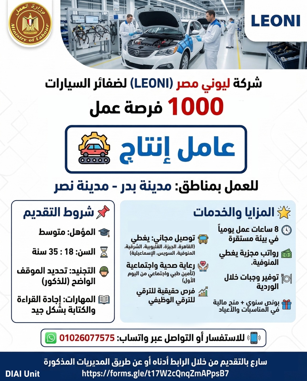 أطلقت وزارة العمل مبادرة جديدة لتشغيل الشباب وتوفير فرص عمل لائقة، إذ أعلنت توافر 1000 فرصة عمل بمهنة "عامل إنتاج" في شركة "ليوني مصر" (LEONI) المتخصصة في صناعة ضفائر السيارات، وذلك للعمل في فروعها بمدينتي "بدر" و"نصر".